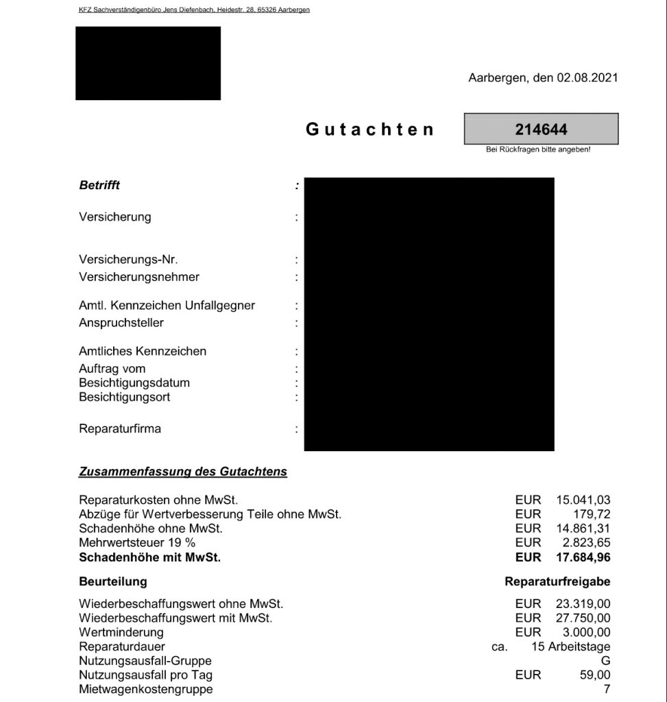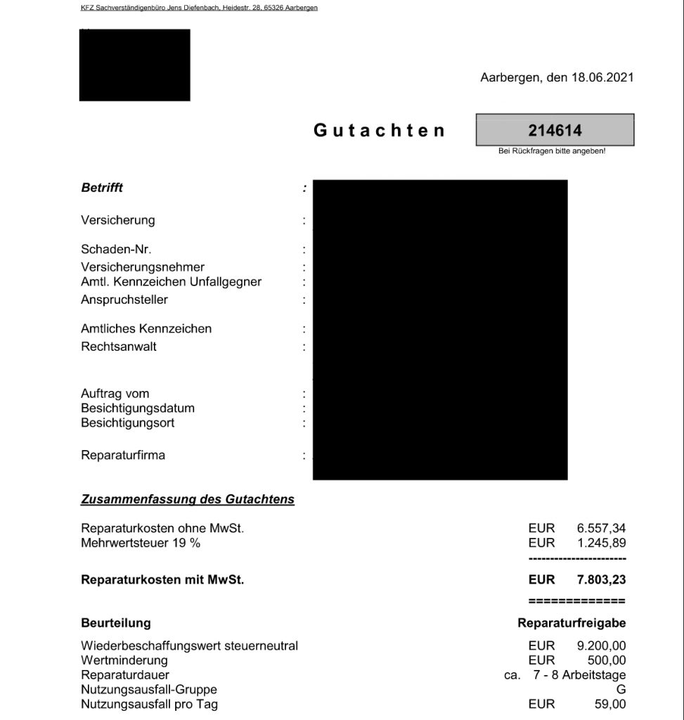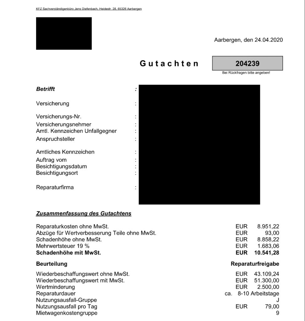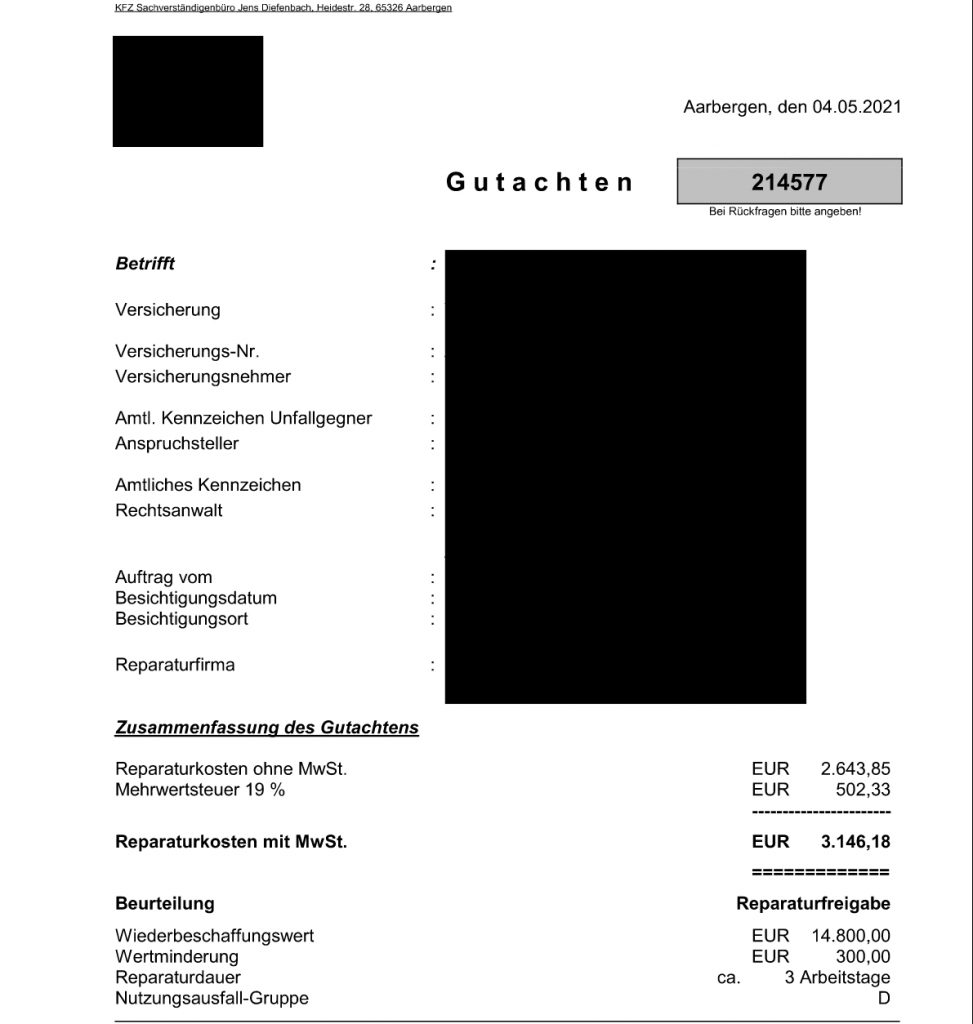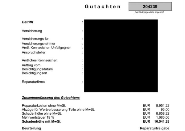 Du entscheidest, ob das Fahrzeug repariert wird oder Du Dir die Reparaturkosten gemäß Gutachten auszahlen lässt.