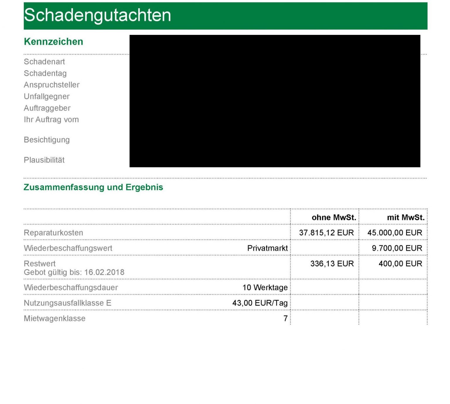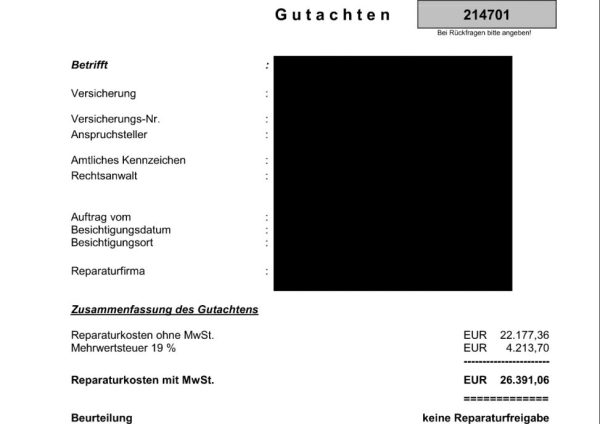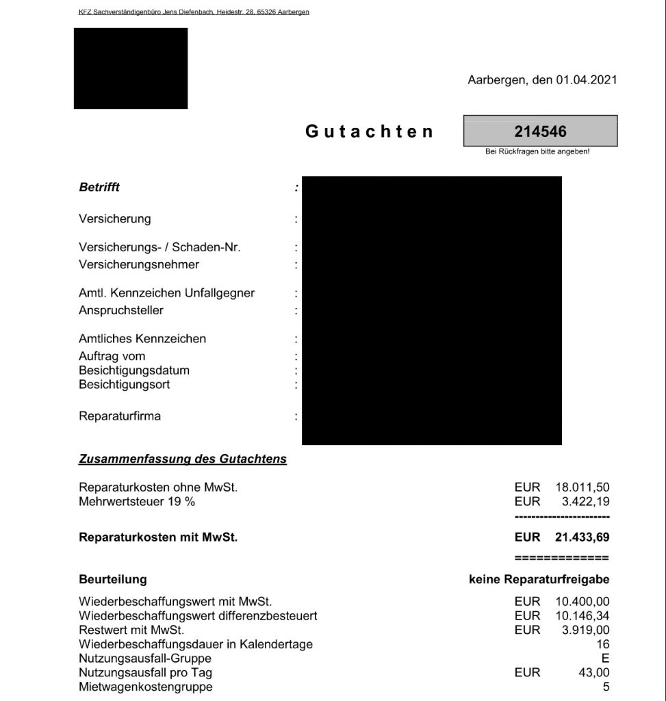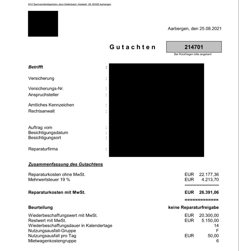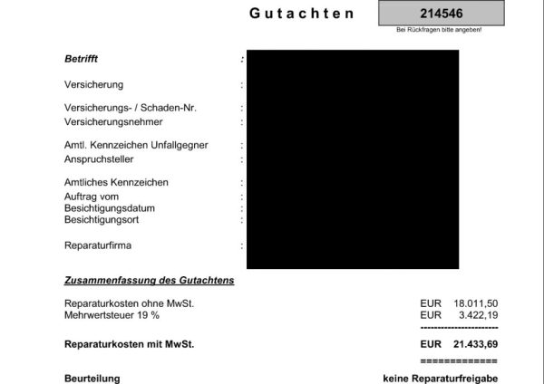 Du entscheidest, ob das Fahrzeug repariert wird oder Du Dir die Reparaturkosten gemäß Gutachten auszahlen lässt.