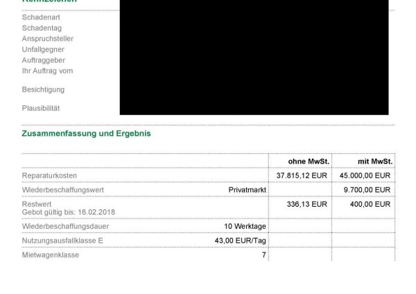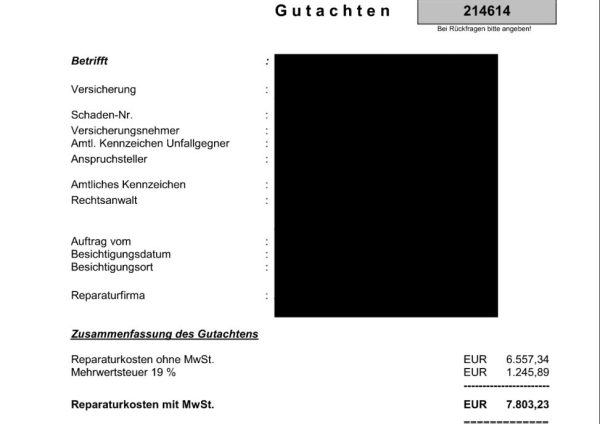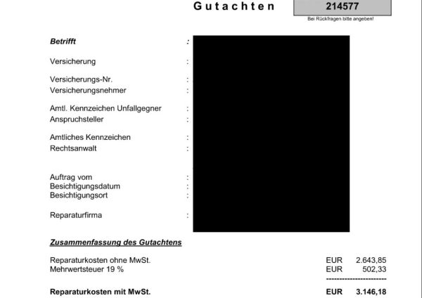 Ein Kfz-Sachverständiger wird Dein Fahrzeug in Kürze begutachten, ohne dass Du Dich um etwas kümmern musst. Das Gutachten dient zur Beweissicherung und liefert detaillierte Informationen über die Schadenshöhe und die Reparaturfähigkeit. Es bildet die Grundlage für eine ordnungsgemäße Schadenabwicklung und hilft bei der Entscheidung über die nächsten Schritte. Das fertige Gutachten wird Dir zeitnah in digitaler Form zugeschickt.